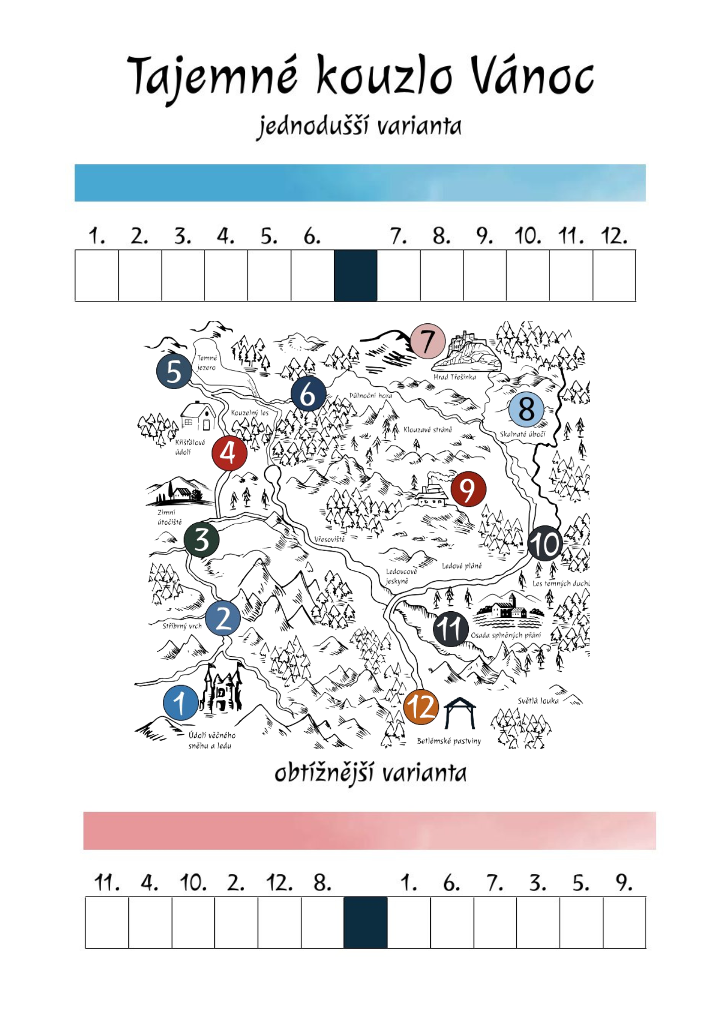 V adventním čase se příroda nachází uprostřed temného a studeného období, kdy světlo začíná soupeřit s tmou o vládu nad světem. V této době ožívají prastaré legendy, minulost se prolíná se současností a vytváří tajuplnou atmosféru plnou magického napětí. Pojďte se s námi ponořit do tohoto magického času, kdy je možné na jedné stezce potkat Mikuláše, Santa Klause, Čarodějku zimního slunovratu, Zimní královnu a další mytické a pohádkové postavy. Tematická stezka obsahuje dvě varianty náročnosti pro mladší a starší děti. Zvolenou variantu není možné během plnění stezky měnit, ale můžete si po zdolání lehčí verze projít s dětmi znovu tu náročnější.