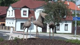 Křižovatku na Kozinově náměstí zdobí sousoší čápů od Jana Švadlenky