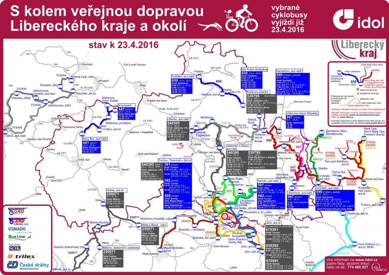 Mapa cyklobusů v Libereckém kraji a okolí včetně jízdních řádů je k dispozici na webu www.iidol.cz/stranky/56:cyklobusy-a-turisticke-linky.html.