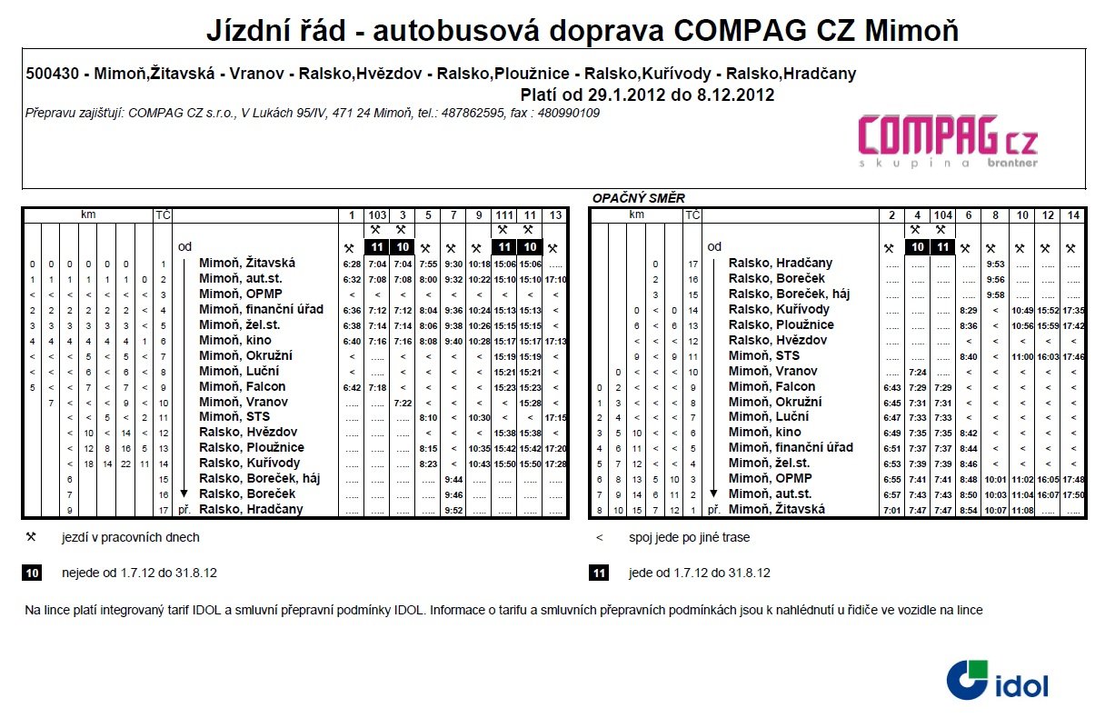 Od 29.1.2012 začne platit nový jízdní řád autobusové dopravy provozované společností COMPAG CZ s.r.o.. Jedná se o linku č.500430 – Mimoň, Žitavská – Vranov – Ralsko, Hvězdov – Ralsko, Ploužnice – Ralsko, Kuřívody – Ralsko, Hradčany. V tomto jízdním řádu, který se významně dotýká dopravy ve městě Mimoni, dojde k několika důležitým úpravám. V první řadě bude změněna začáteční a zároveň konečná zastávka na celé lince, kterou dosud byla zastávka na sídl. Letná před školou. Z důvodu zvýšeného množství parkujících aut zejména v ranních hodinách a nemožnosti dodržení bezpečnostních opatřeních při pohybu autobusu v tomto prostoru, bude tato zastávka přesunuta na ulici Žitavskou k tenisovým kurtům (výstupní) , naproti poté bude využita zastávka k účelům nástupním. Další významnou změnou je omezení zajíždění na Sídliště pod Ralskem na zastávky Okružní a Luční. Linka tudy povede pouze v ranních hodinách a jedním odpoledním spojem. K tomuto opatření bylo přistoupeno z důvodu prakticky nulového využití. Další nevyužitý spoj, zejména v období letních prázdnin, je zajíždění do Vranova. Tato zastávka bude v průběhu velkých letních prázdnin zcela vypuštěna z linky. Poslední změnou je naopak rozšíření linky o dva spoje, a to o ranní spoj od 7:55 hod. z Mimoně do Kuřívod a od 8:29 zpět z Kuřívod do Mimoně. Oba spoje povedou přes vlakové nádraží v Mimoni , tj. občané můžou využívat návazné vlakové spoje či služby mimoňského zdravotního střediska.