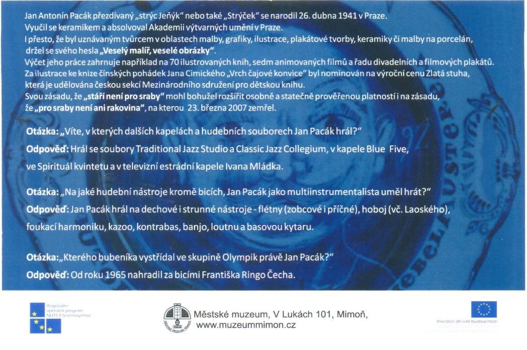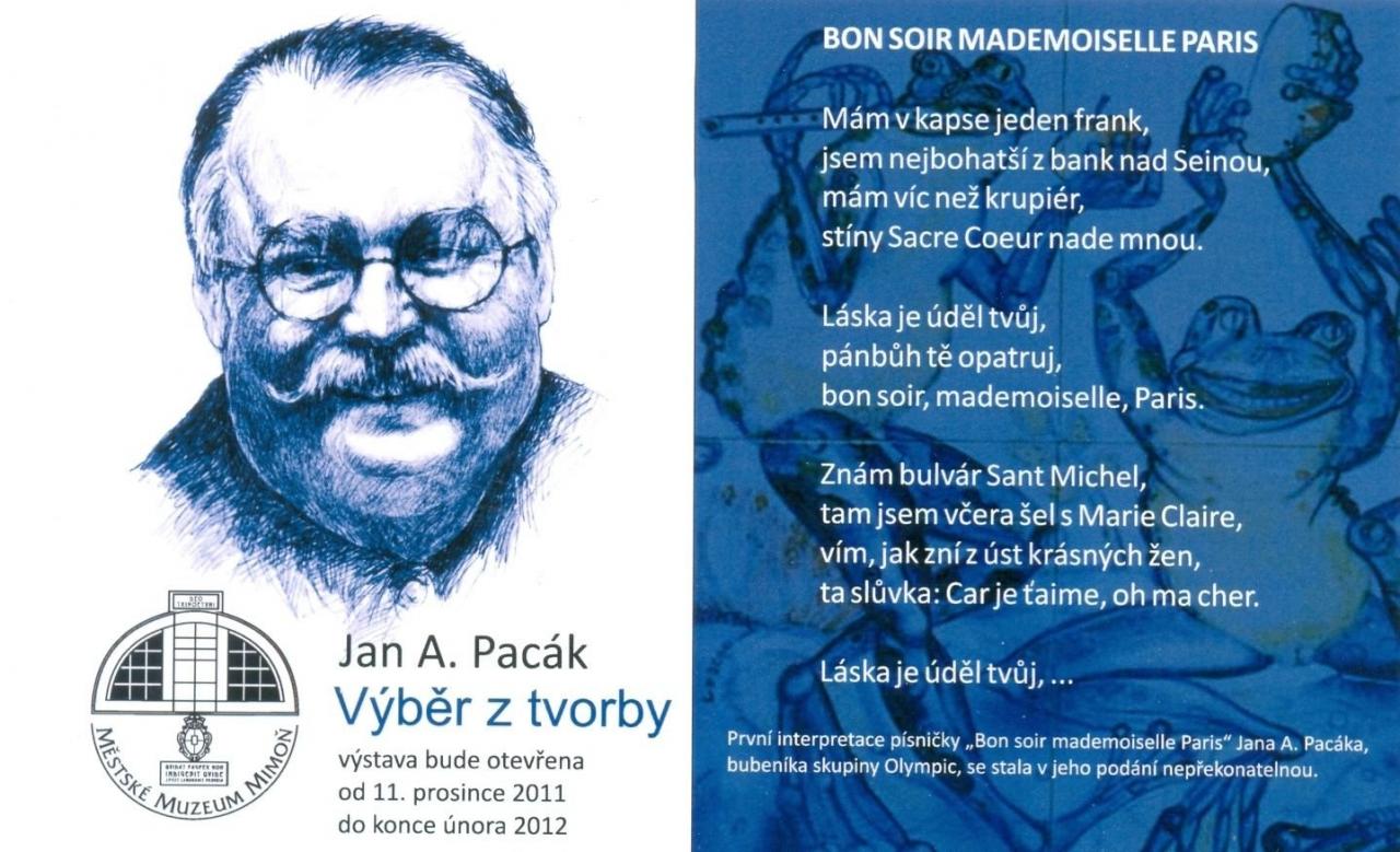 Vážení diváci, městu Mimoni se dostalo obrovské cti a od neděle 11. prosince 2011 se může chlubit otevřením Galerie Jana Antonína Pacáka, akademického malíře a mimo jiné i skvělého hudebníka známého ze skupiny Olympic.