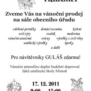 První pozvánka je na vánoční prodej zdobených perníčků, medoviny, uměleckých předmětů, uzeniny, svařáku a mnoho dalšího. Tyto vánoční trhy se konají 17.prosince od 9. do 15 hod. na sále obecního úřadu v Bohaticích.