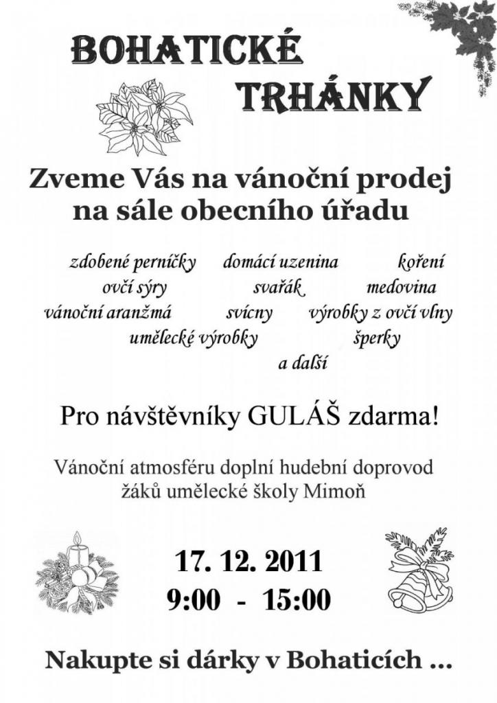 První pozvánka je na vánoční prodej zdobených perníčků, medoviny, uměleckých předmětů, uzeniny, svařáku a mnoho dalšího. Tyto vánoční trhy se konají 17.prosince od 9. do 15 hod. na sále obecního úřadu v Bohaticích.