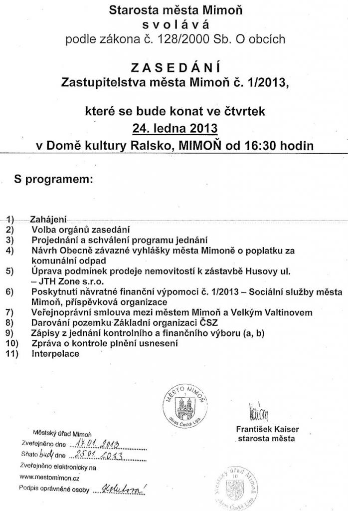 USNESENÍ z 1. zasedání Zastupitelstva města Mimoň, které se konalo dne 24., ledna 2013 od 16:30 hodin v KD Ralsko Mimoň.
