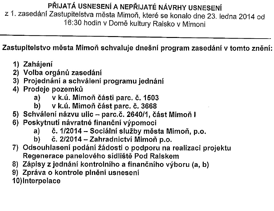 Záznam z 1. zasedání Zastupitelstva města Mimoň, které se konalo dne 23. ledna 2014 od 16:30 hodin v DK Ralsko Mimoň. USNESENÍ ke stažení ZDE.