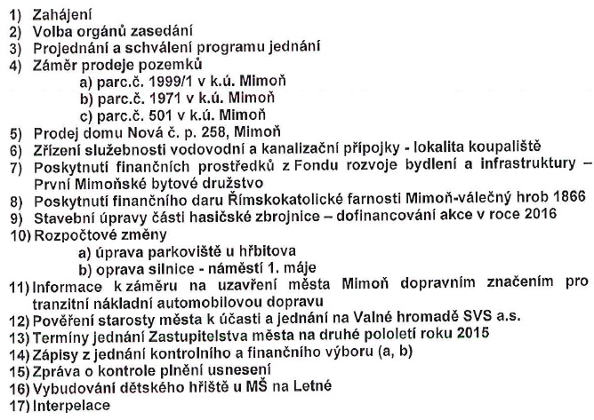 Záznam z 5. zasedání Zastupitelstva města Mimoň, které se konalo dne 21. května 2015 od 16:30 hodin v zasedací místnosti MěÚ č.3. USNESENÍ ke stažení ZDE.