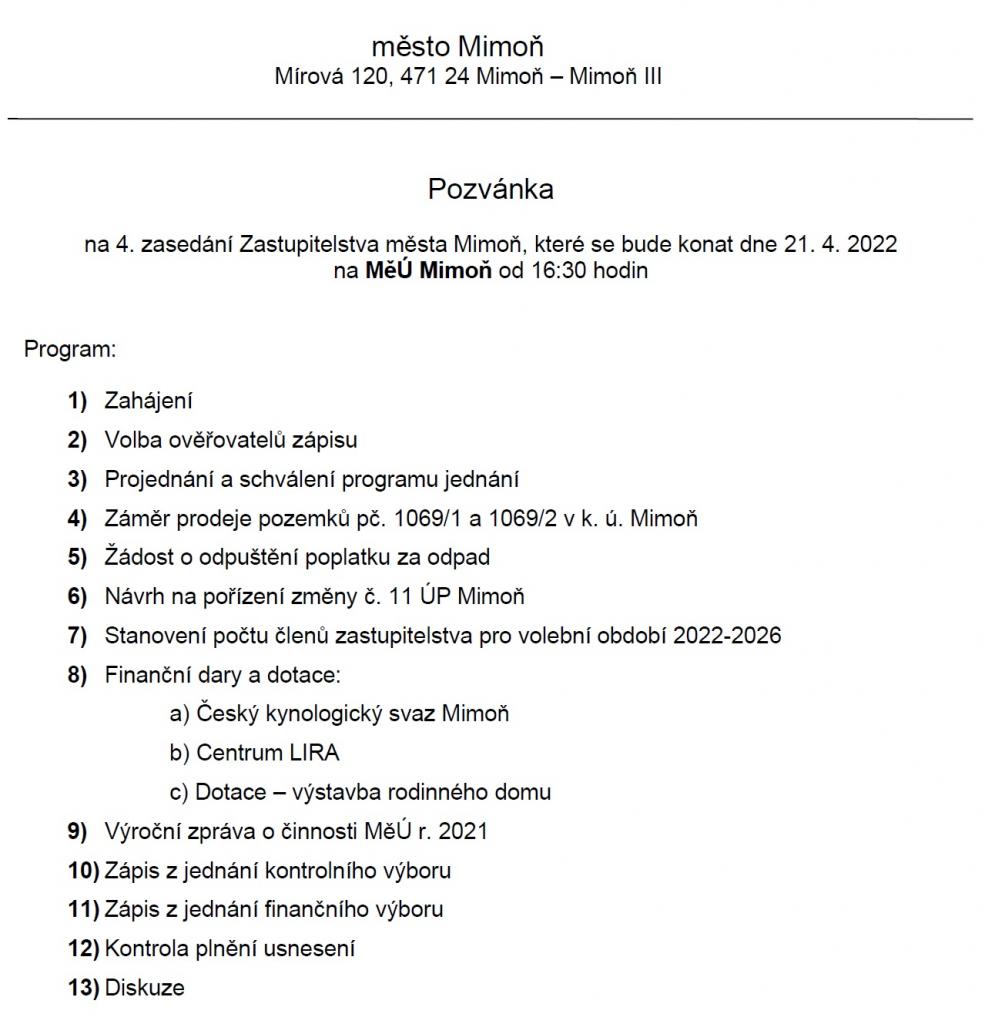 Záznam ze 4. zasedání Zastupitelstva města Mimoň, které se konalo dne 21. dubna 2022. USNESENÍ ke stažení ZDE.