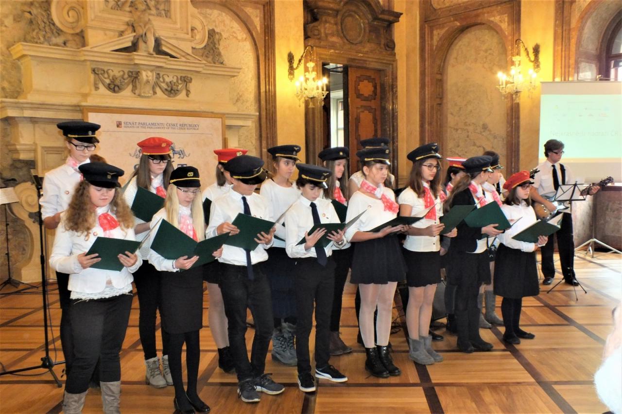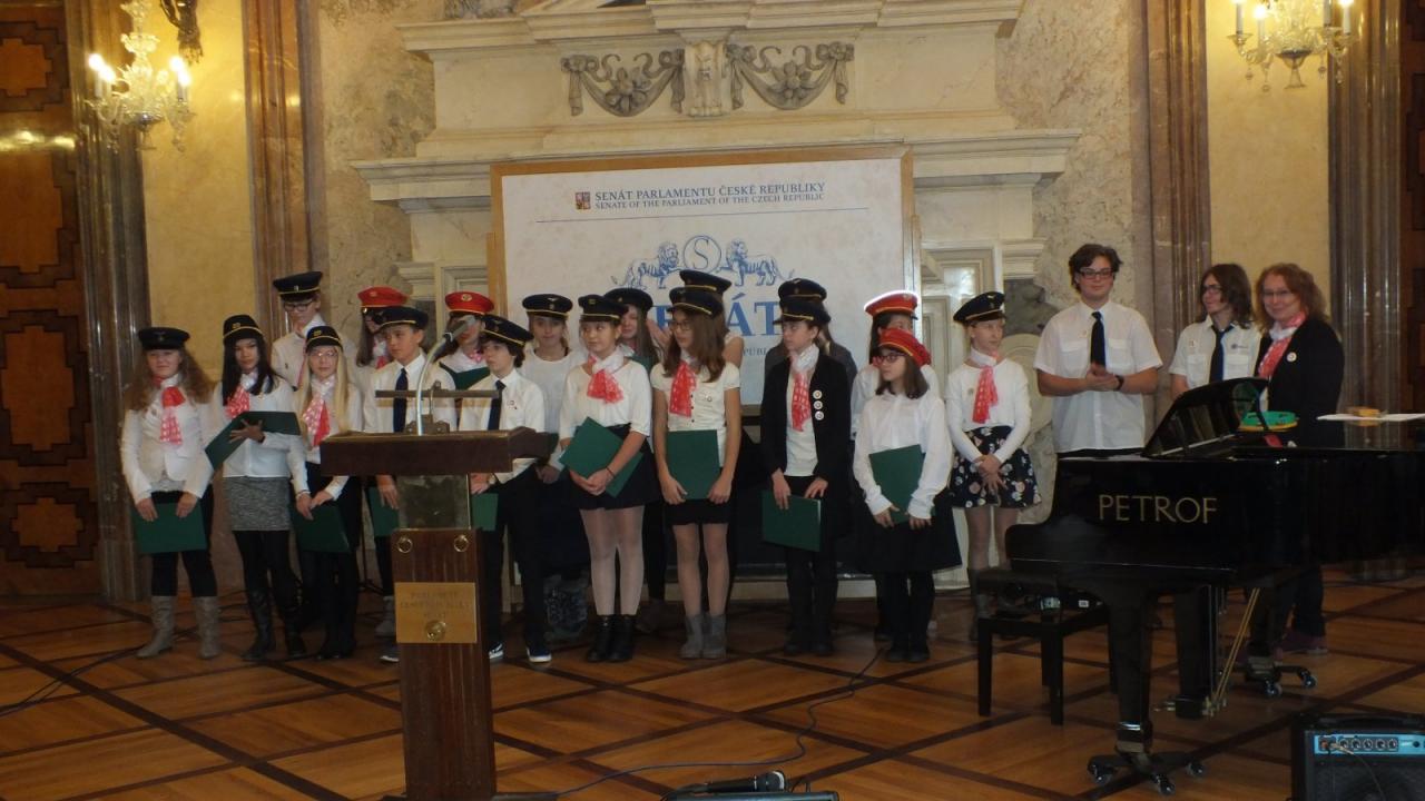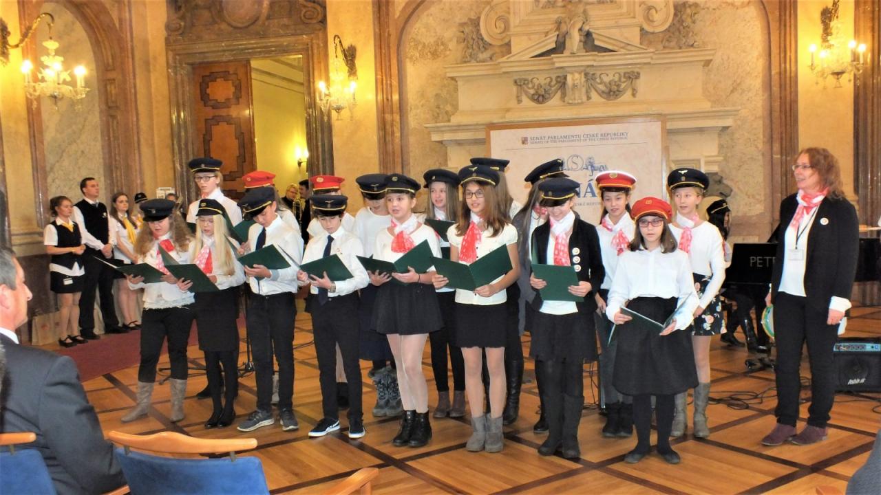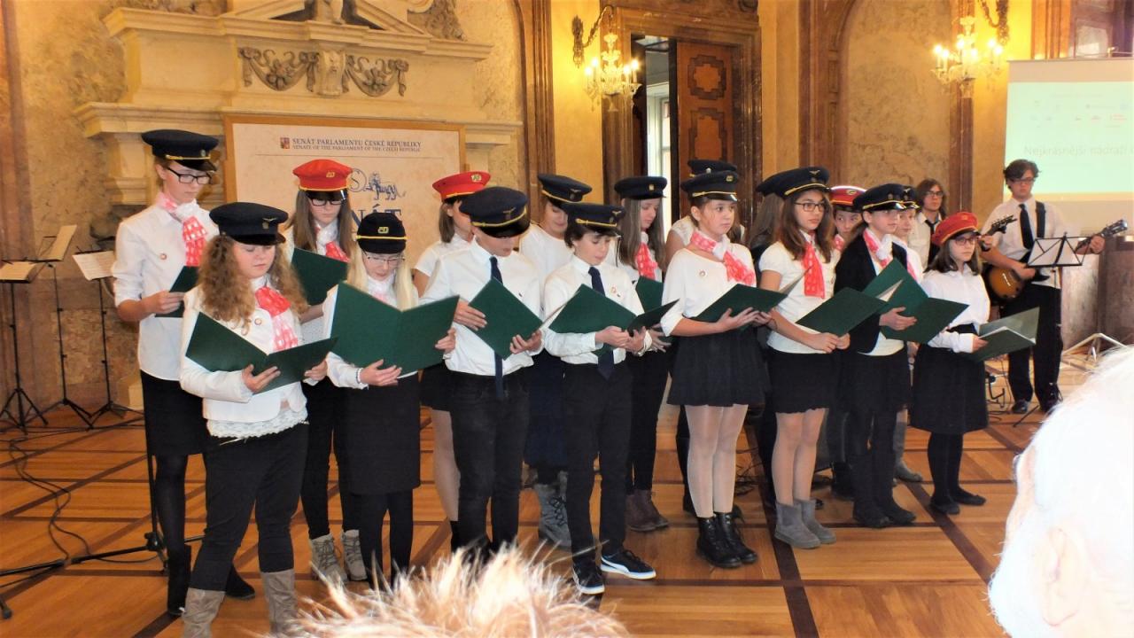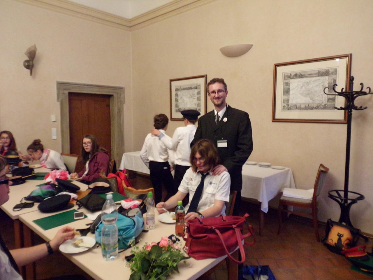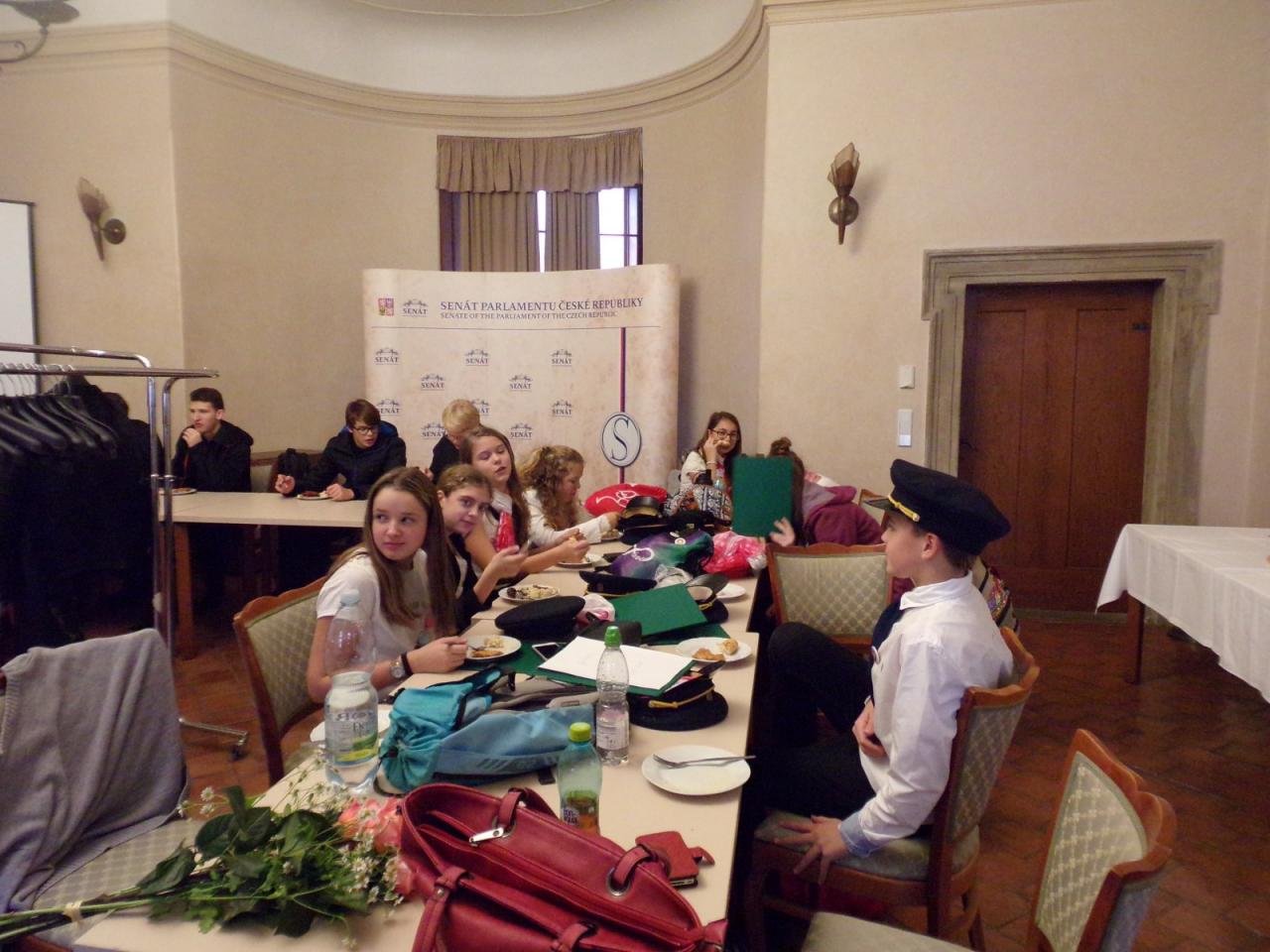 Mimoňští studenti tak měli možnost setkat se osobně s panem Svěrákem a prohlédnout si reprezentativní prostory Valdštejnského paláce. Nakonec si pochutnali na výborném dortu ve tvaru Dokeského nádraží i s historickou parní lokomotivou.